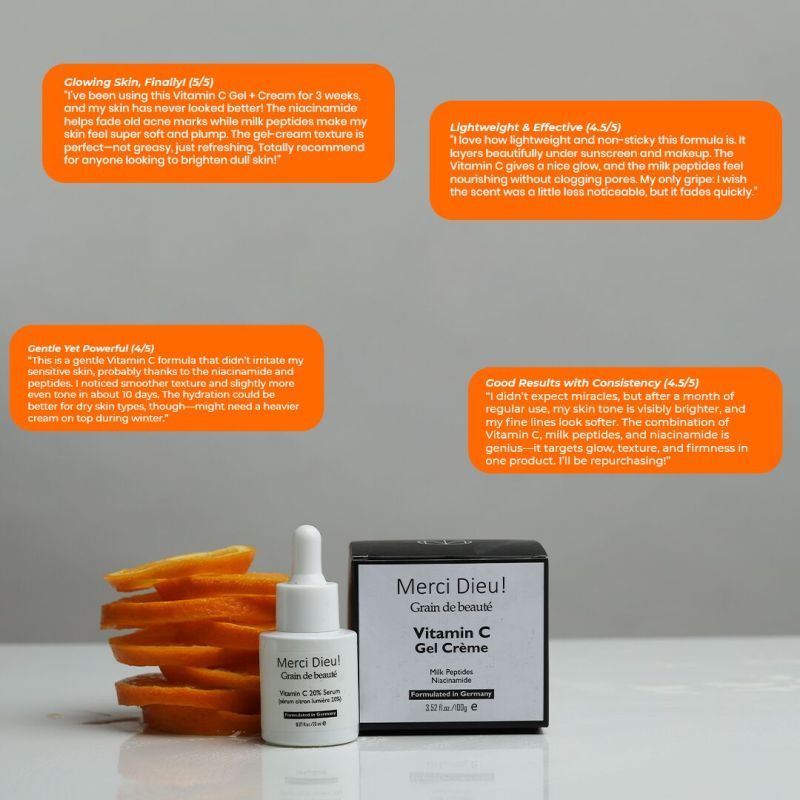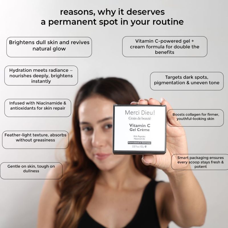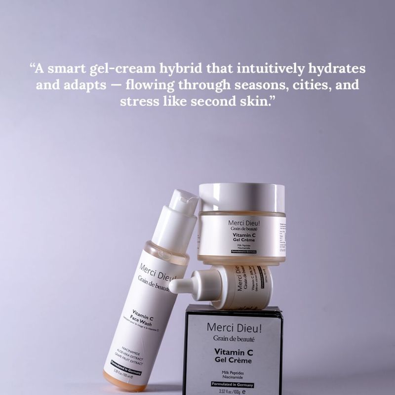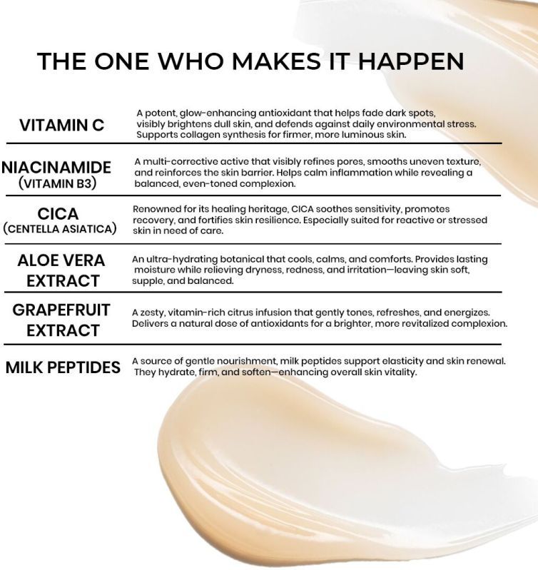 The power of Vitamin C, milk peptides, and niacinamide in this featherlight gel cream. Specially designed to brighten, hydrate, and firm, this formula sinks into the skin without clogging pores or leaving residue. It revives tired, uneven skin tones while smoothing texture and providing antioxidant protection. Ideal for daily use, it delivers visible clarity, deep nourishment, and a soft, natural glow — all in one clean, non-greasy formula.