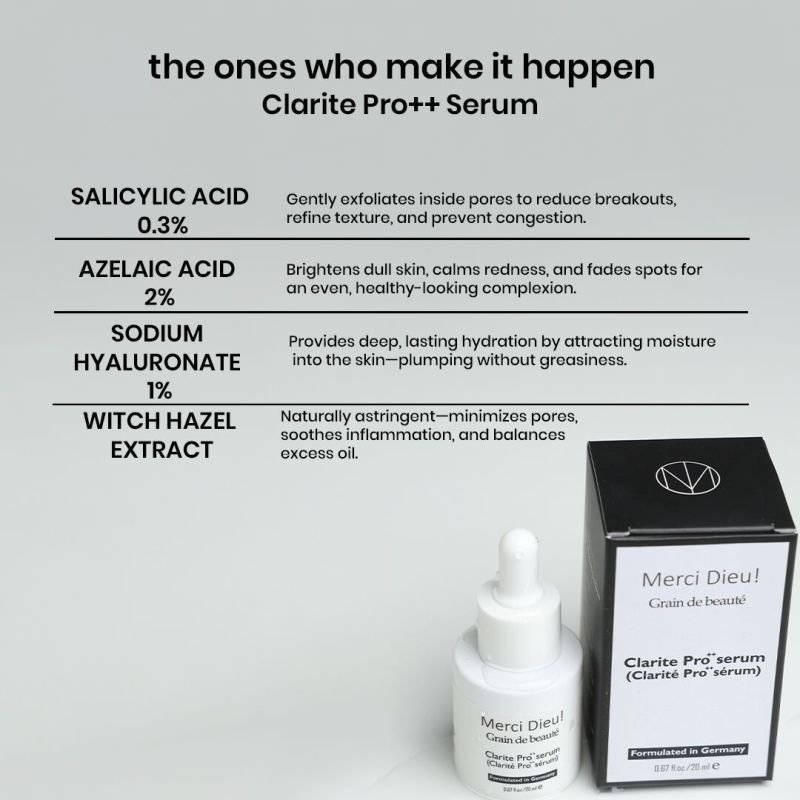 Clarité Pro++ Face Serum is your go-to solution for oily and acne-prone skin. This is recommended formula blends high-potency actives like salicylic acid, azelaic acid, and niacinamide to purify pores, reduce inflammation, and rebalance sebum production. Perfect for those seeking a clear, smooth, and oil-free complexion.